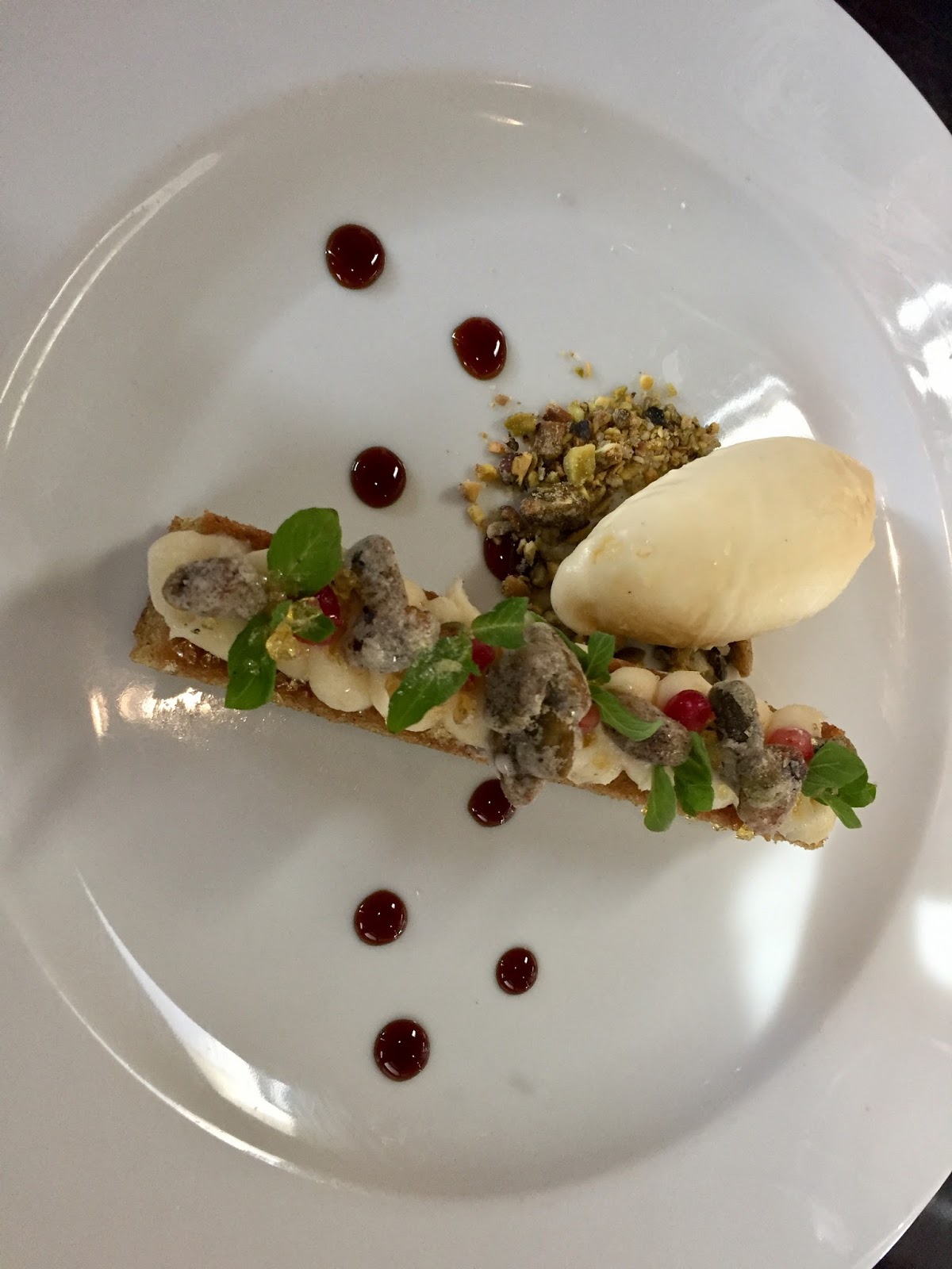 アイスクリームはジンジャー味で、そのまま食べるとまあまあなのですが、スパイスケーキとの相性が抜群。この点々のソースも甘酸っぱくて全部一緒に食べるとまた違う味が楽しめます。